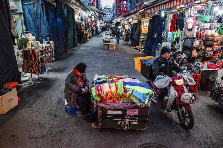 1月17日,在韩国首尔南大门市场,摊贩们在等待顾客上门。(法新社)
